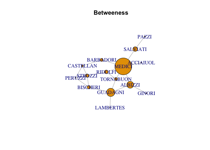 plot(florentine_g, vertex.size = betweenness(florentine_g), main = "Betweeness")