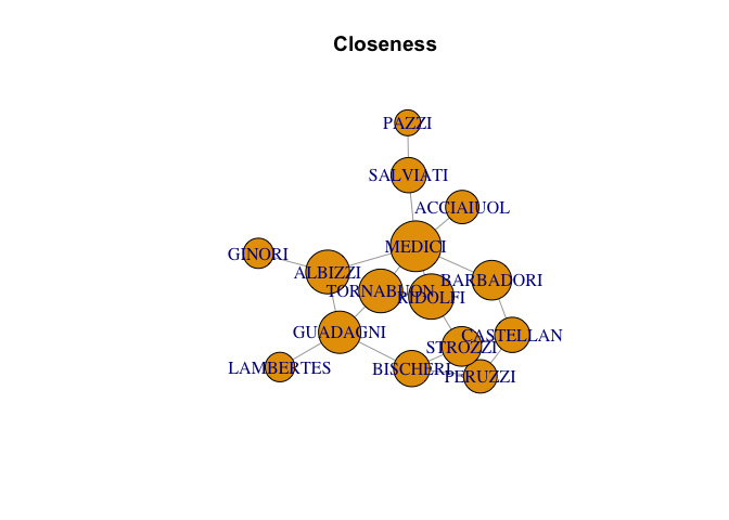 plot(florentine_g, vertex.size = closeness(florentine_g)*1000, main = "Closeness")