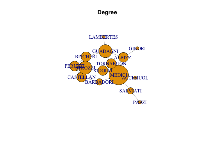 plot(florentine_g, vertex.size = degree(florentine_g)*10, main = "Degree")