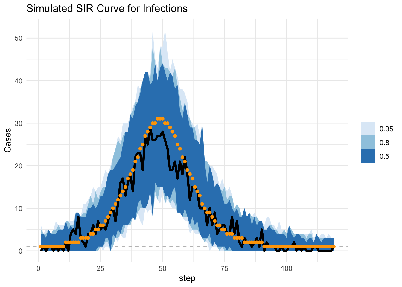 title = "Simulated SIR Curve for Infections",