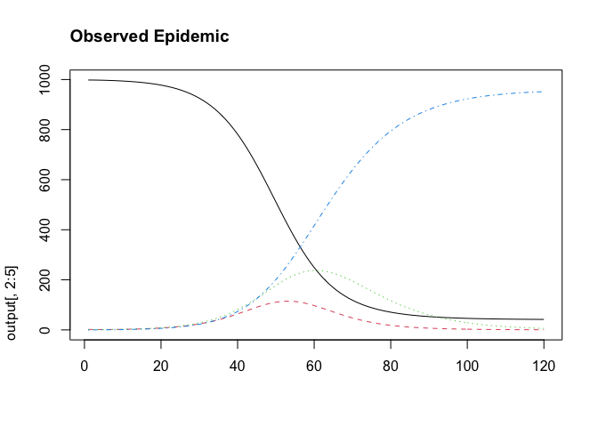 matplot(output[,2:5], main = "Observed Epidemic", type = "l", adj =0)