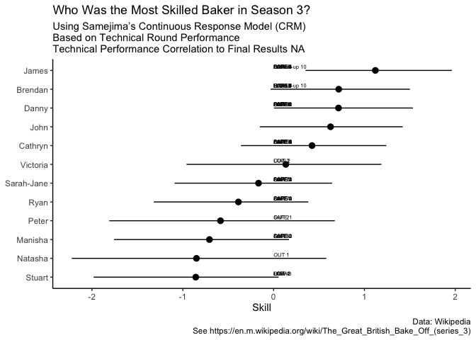 This set-up is perfect for understanding how well the judges can estimate “ability” to use a psychometric term. Because we have contestants facing the same exact challenge and being judged blindly, we can use pyschometric tools to judge the “ability” of the baker and the “difficulty” of the challenge. There is a lot of noise on these measures due to the fact that contestants are eliminated after each show meaning that they do not get a chance at each challenge, but it will give a little bit of insight the ability of the bakers. We can then compare the outcomes of each round with the judged “technical” ability.